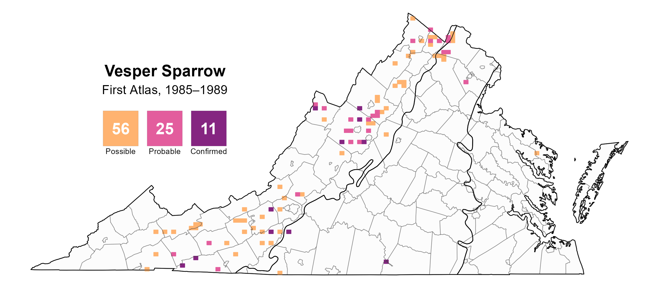 Figure 3: Vesper Sparrow breeding observations from the First Atlas (1985–1989). The colored boxes illustrate Atlas blocks (approximately 10 mi2 [26 km2] survey units) where the species was detected. The colors show the highest breeding category recorded in a block. The numbers within the colors in the legend correspond to the number of blocks with that breeding evidence category.