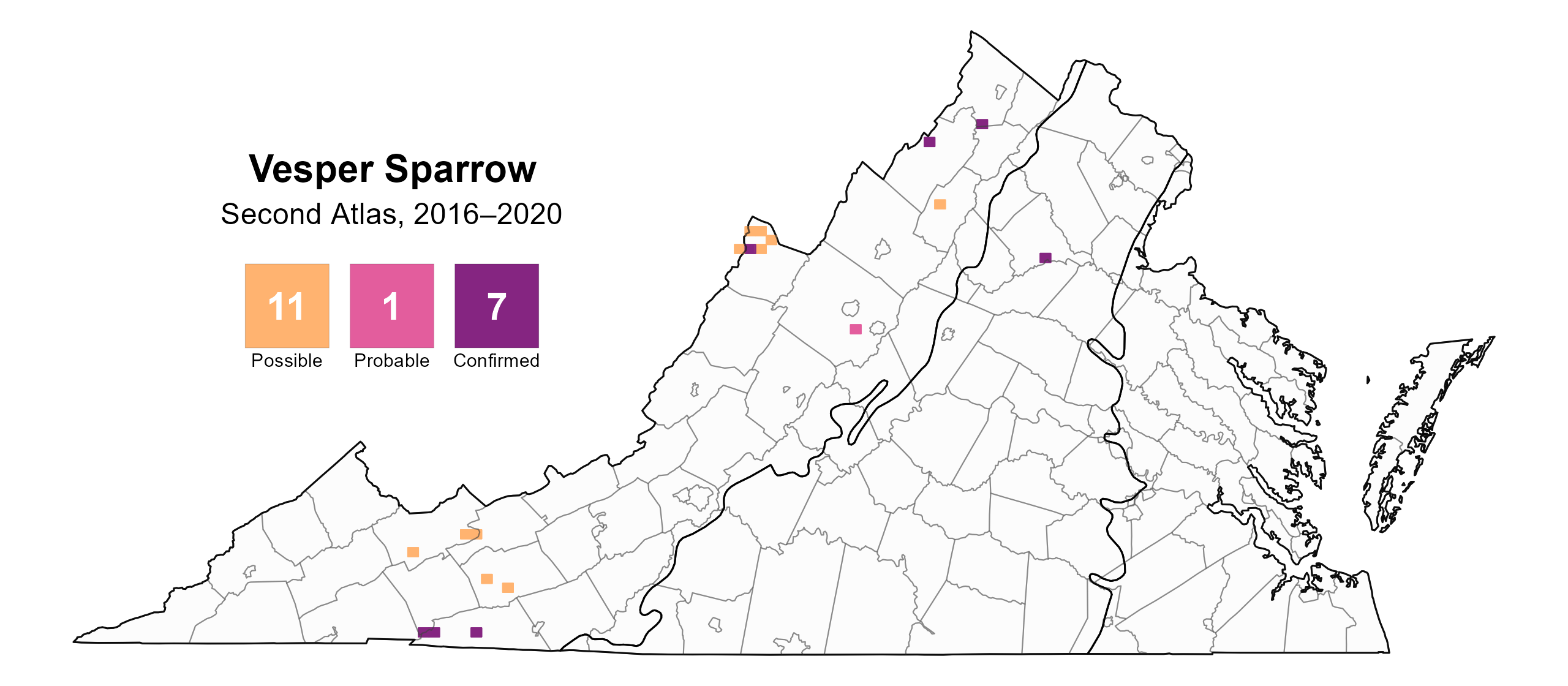 Vesper Sparrows were confirmed breeders in seven blocks and six counties (Figure 2). In the Mountains and Valleys region, they were confirmed breeders in Middletown (Frederick County), in Alonzaville (Shenandoah County), along Bear Mountain Road (Highland County), at Whitetop Mountain, in Grayson Highlands State Park, and in the town of Independence (Grayson County).