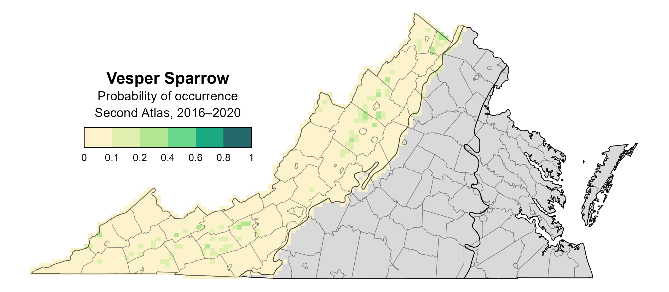 Figure 1: Vesper Sparrow breeding distribution based on probability of occurrence (Second Atlas, 2016–2020). This map indicates the probability that this species will occur in an Atlas block (an approximately 10 mi2 [26 km2] survey unit) based on environmental (including habitat) factors and after adjusting for the probability of detection (variation in survey effort among blocks). Blocks in gray are outside the species’ core range and were not modeled.