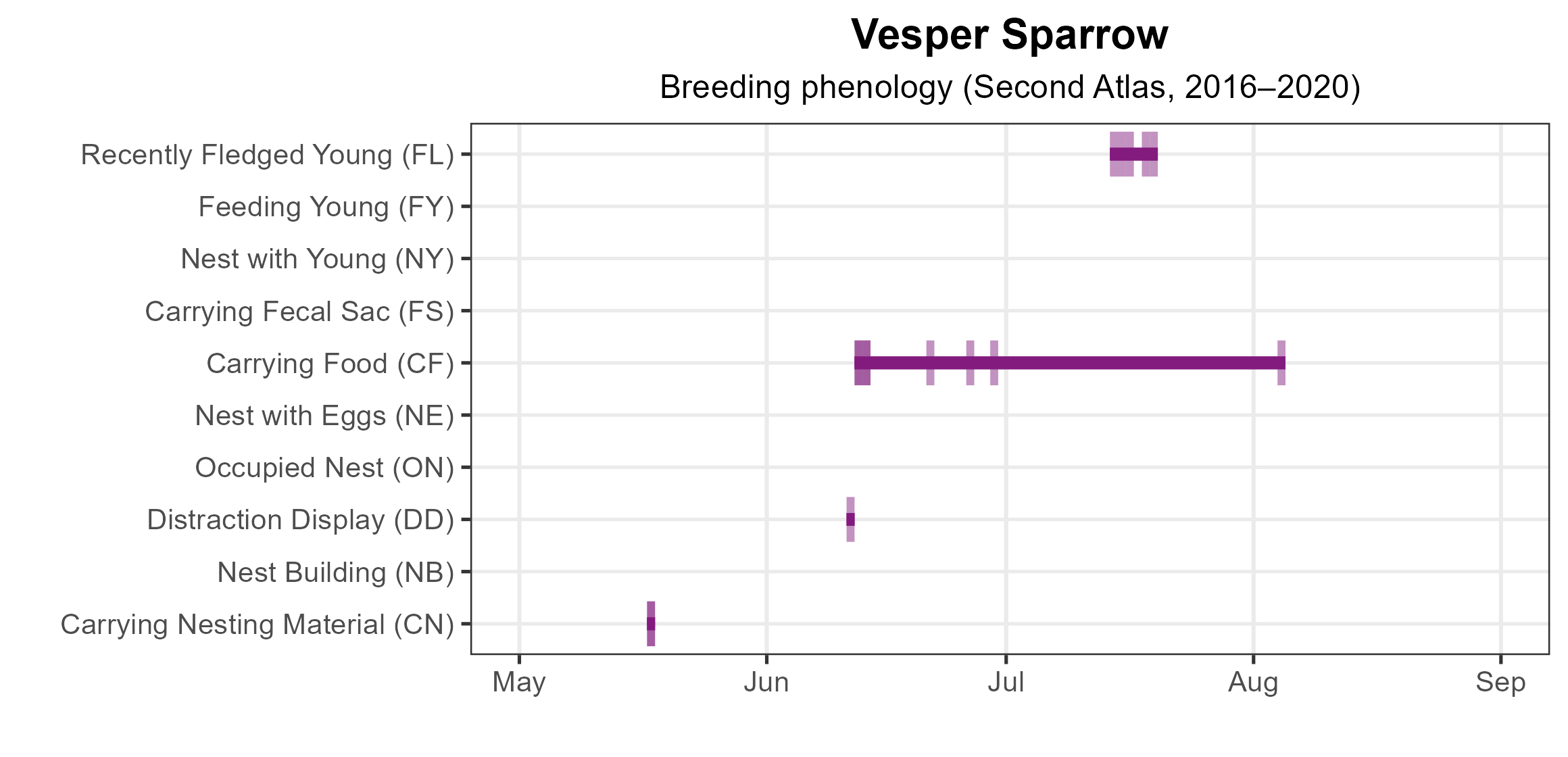 Figure 4: Vesper Sparrow phenology: confirmed breeding codes. This graph shows a timeline of confirmed breeding behaviors. Tick marks represent individual observations of the behavior.
