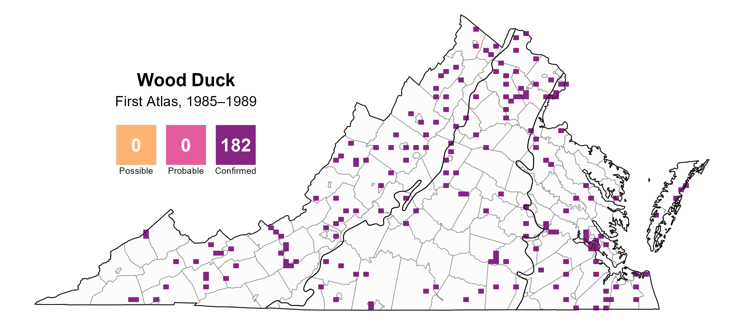 Figure 2: Wood Duck breeding observations from the First Atlas (1985–1989). The colored boxes illustrate Atlas blocks (approximately 10 mi2 [26 km2] survey units) where the species was detected. The colors show the highest breeding category recorded in a block. The numbers within the colors in the legend correspond to the number of blocks with that breeding evidence category.