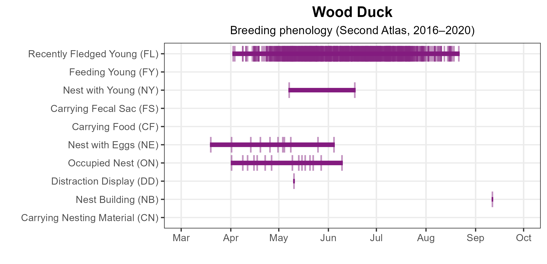 Figure 3: Wood Duck phenology: confirmed breeding codes. This graph shows a timeline of confirmed breeding behaviors. Tick marks represent individual observations of the behavior.