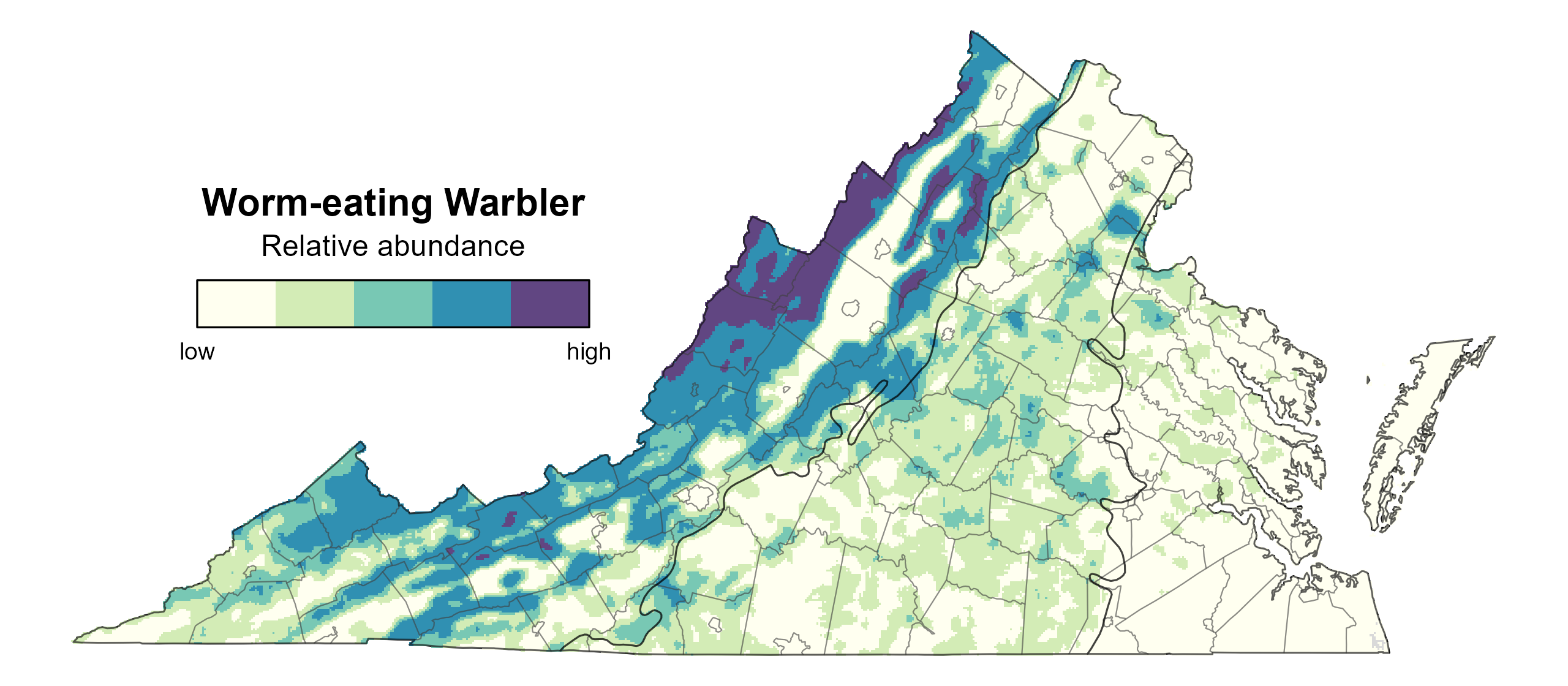 Worm-eating Warbler relative abundance was estimated to be highest in the northern Mountains and Valleys region, particularly along the border with West Virginia and in the Blue Ridge Mountains (Figure 7).
