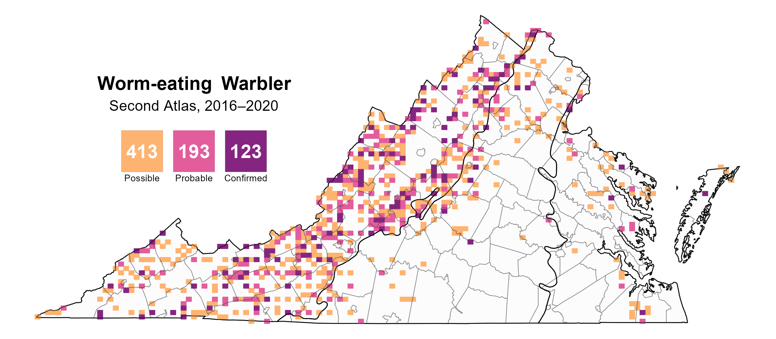 Worm-eating Warblers were confirmed breeders in 123 blocks across 42 counties and probable breeders in an additional 20 counties (Figure 4). The distribution of breeding observations during the Second Atlas was largely similar to that during the First Atlas (Figure 5), with new confirmations in some areas, such as on the Middle Peninsula and Eastern Shore. Some counties, such as Fairfax, had sightings and possible breeders during both Atlases but no confirmations.