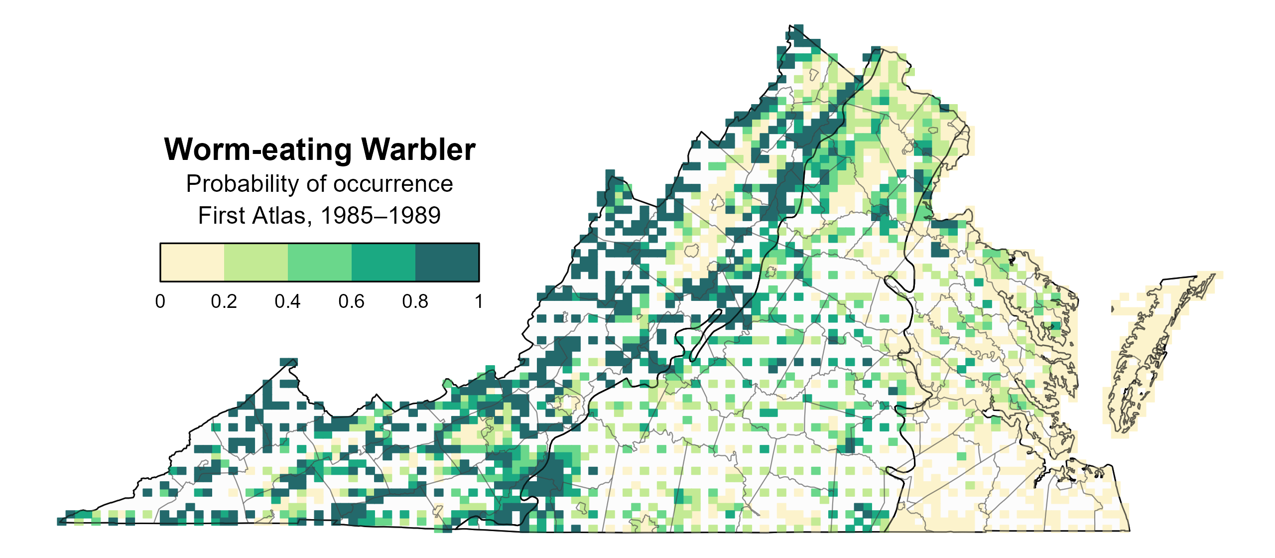 Figure 2: Worm-eating Warbler breeding distribution based on probability of occurrence (First Atlas, 1985–1989). This map indicates the probability that this species will occur in an Atlas block (an approximately 10 mi2 [26 km2] survey unit) based on environmental (including habitat) factors and after adjusting for the probability of detection (variation in survey effort among blocks). Blocks in white were not surveyed during the First Atlas and were not modeled.