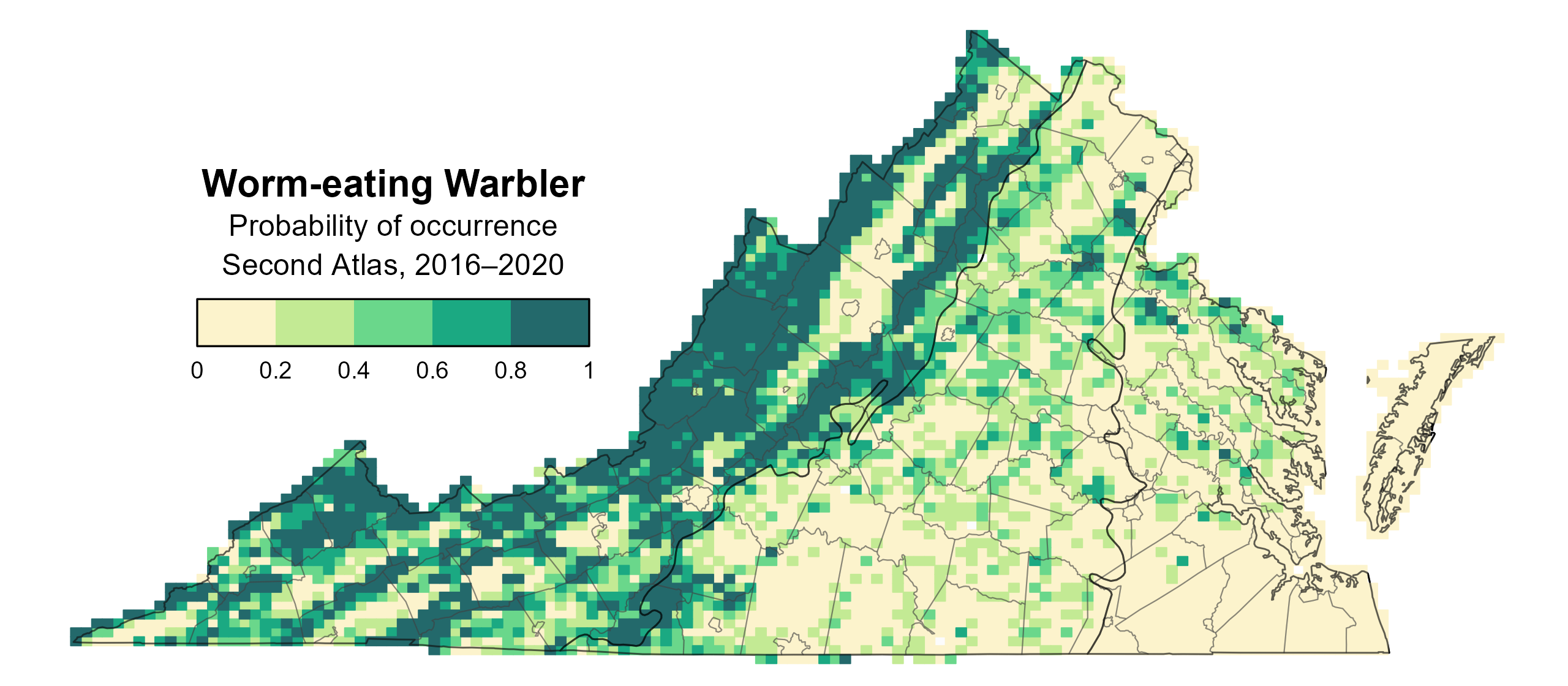 Figure 1: Worm-eating Warbler breeding distribution based on probability of occurrence (Second Atlas, 2016–2020). This map indicates the probability that this species will occur in an Atlas block (an approximately 10 mi2 [26 km2] survey unit) based on environmental (including habitat) factors and after adjusting for the probability of detection (variation in survey effort among blocks).