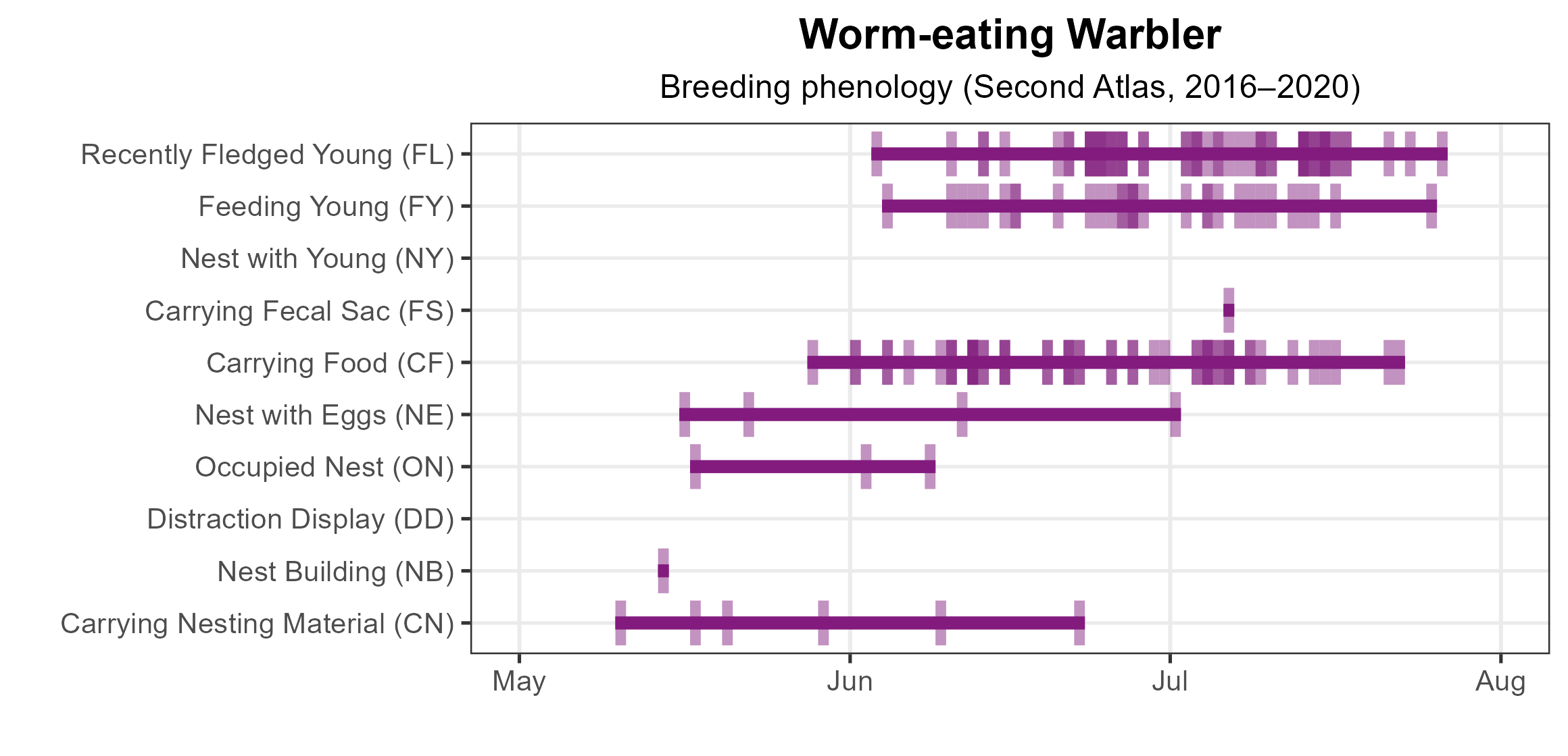 Figure 6: Worm-eating Warbler phenology: confirmed breeding codes. This graph shows a timeline of confirmed breeding behaviors. Tick marks represent individual observations of the behavior.