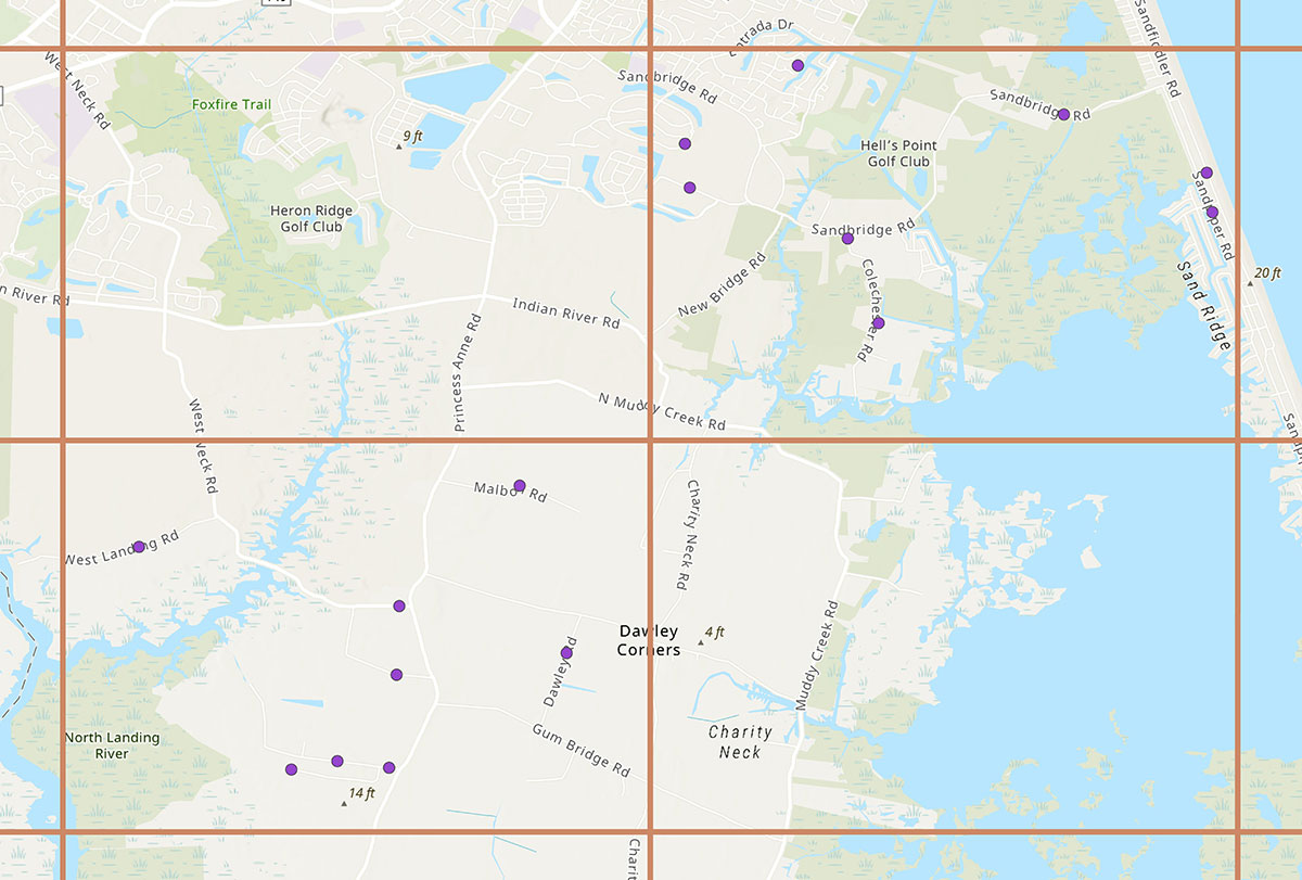 Data collection took place within individual survey units known as Atlas blocks. A block represents 1/6th of a 7.5 minute U.S. Geological Survey (USGS) topographic quadrangle map. Blocks ranged in area from 9.6 to 10.0 mi2 (24.8 to 25.9 km2). The block grid overlaying the state of Virginia consists of 4,421 blocks (Figure 1). This grid includes blocks that are not wholly contained within Virginia and instead cross state lines with neighboring West Virginia to the west, North Carolina to the south, and Maryland and the District of Colombia to the north. Additional blocks along the coastline and the Eastern Shore fall partially within the waters of the Chesapeake Bay and its major tributaries, as well as the Atlantic Ocean.