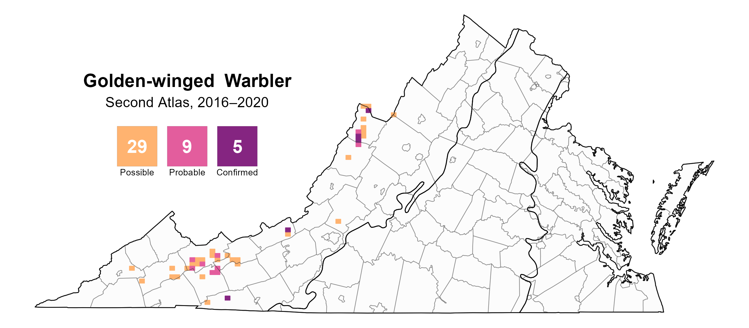 Figure 4: Golden-winged Warbler breeding observations from the Second Atlas (2016–2020). The colored boxes illustrate Atlas blocks (approximately 10 mi2 [26 km2] survey units) where the species was detected. The colors show the highest breeding category recorded in a block. The numbers within the colors in the legend correspond to the number of blocks with that breeding evidence category.