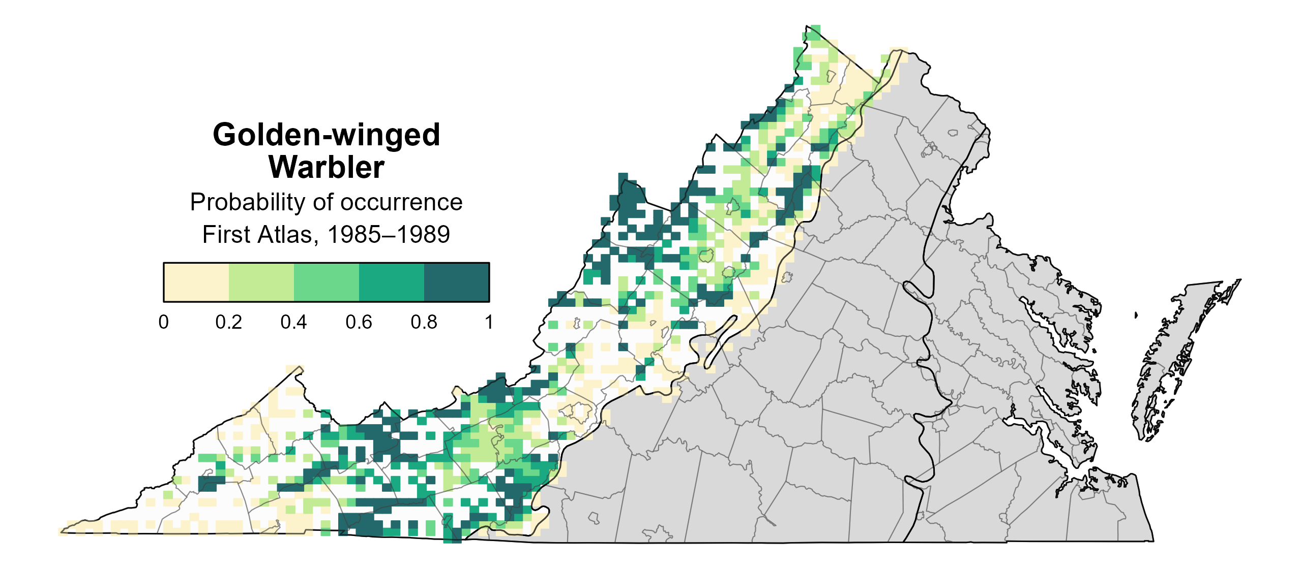 Figure 2: Golden-winged Warbler breeding distribution based on probability of occurrence (First Atlas, 1985–1989). This map indicates the probability that this species will occur in an Atlas block (an approximately 10 mi2 [26 km2] survey unit) based on environmental (including habitat) factors and after adjusting for the probability of detection (variation in survey effort among blocks). Blocks in white were not surveyed during the First Atlas and were not modeled. Blocks in gray are outside the species’ core range and were not modeled.