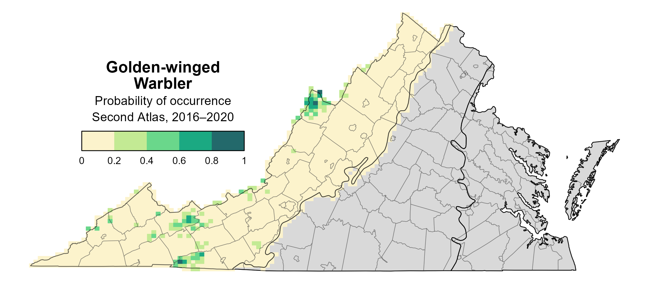 Figure 1: Golden-winged Warbler breeding distribution based on probability of occurrence (Second Atlas, 2016–2020). This map indicates the probability that this species will occur in an Atlas block (an approximately 10 mi2 [26 km2] survey unit) based on environmental (including habitat) factors and after adjusting for the probability of detection (variation in survey effort among blocks). Blocks in gray are outside the species’ core range and were not modeled.