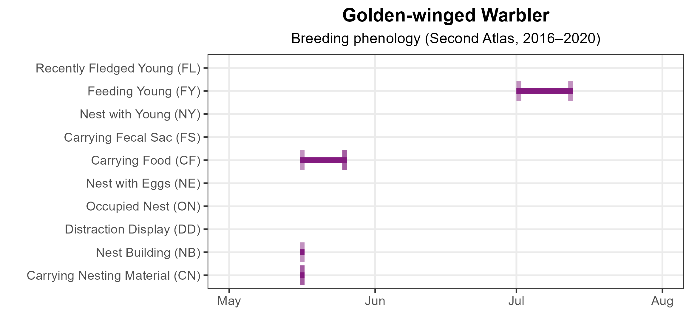 Figure 6: Golden-winged Warbler phenology: confirmed breeding codes. This graph shows a timeline of confirmed breeding behaviors. Tick marks represent individual observations of the behavior.