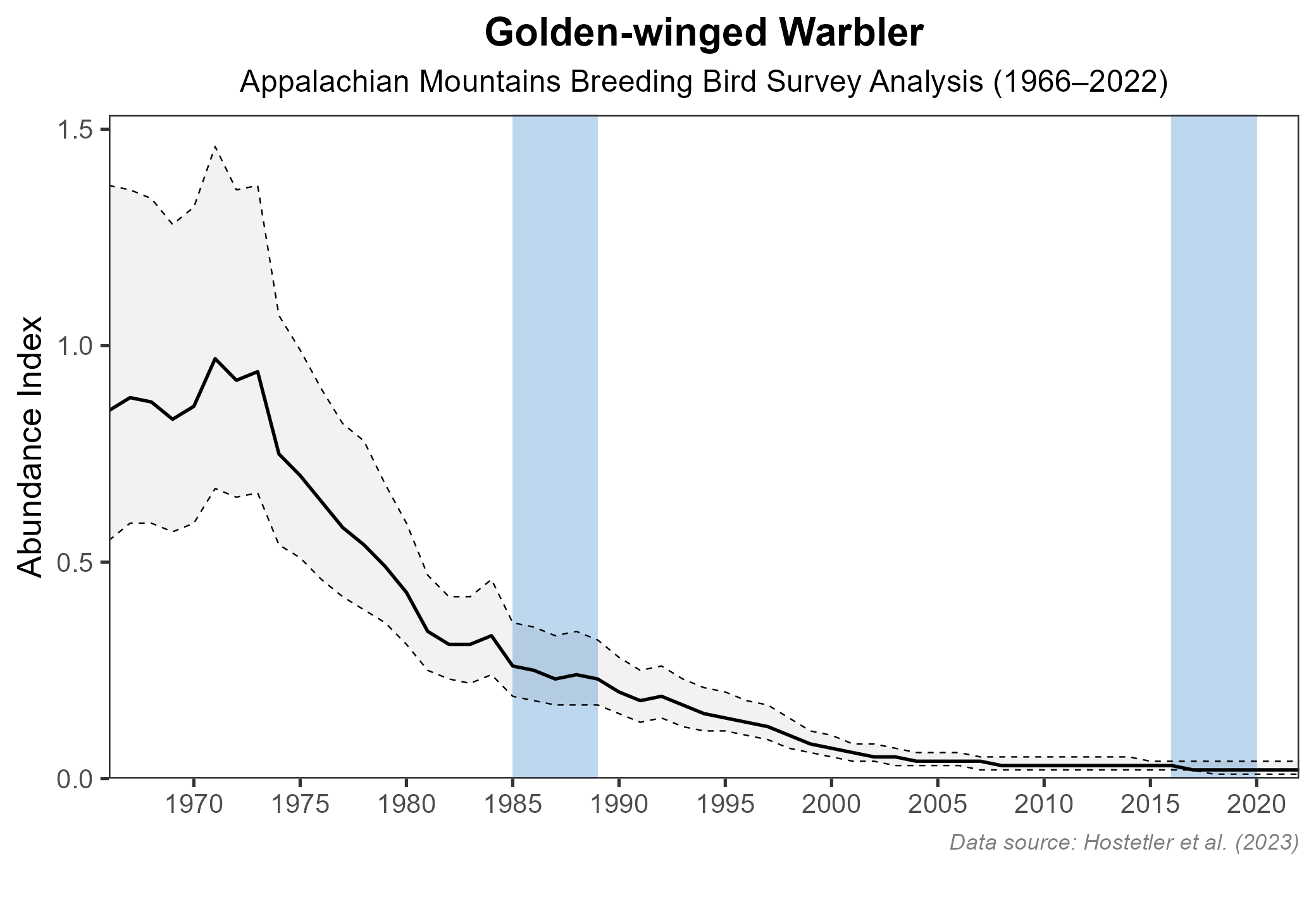 Figure 7: Golden-winged Warbler population trend for the Appalachian Mountains as estimated by the North American Breeding Bird Survey. The vertical axis shows species abundance; the horizontal axis shows the year. The solid line indicates the estimated population trend; there is a 97.5% probability that the true population trend falls between the dashed lines. The shaded bars indicate the First and Second Atlas periods.