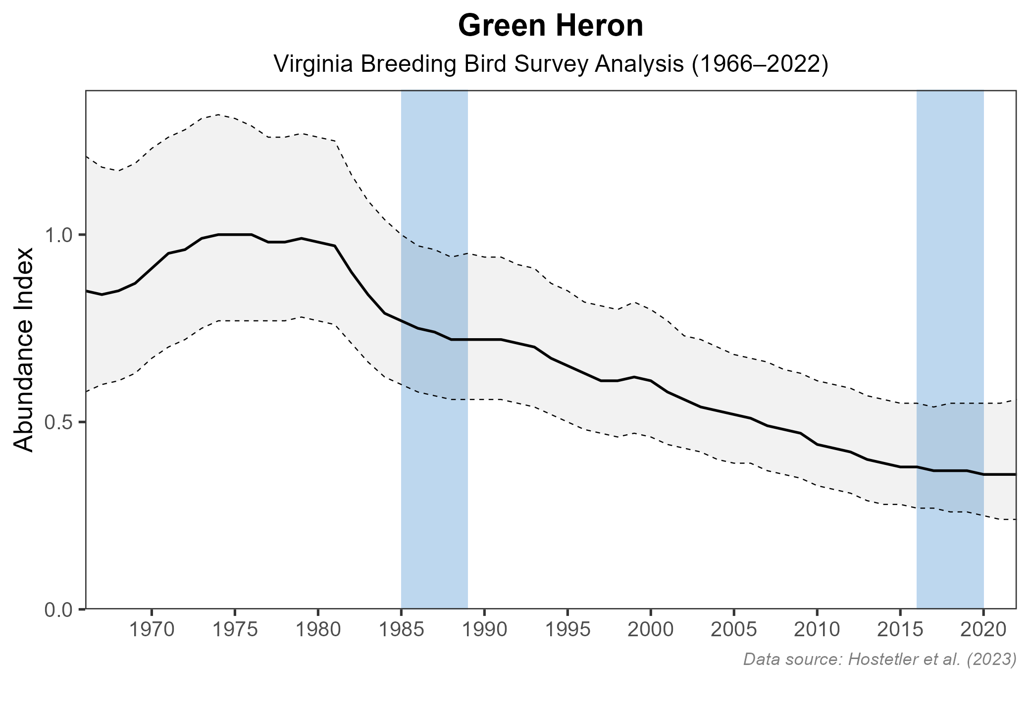 The total estimated Green Heron population in the state is approximately 20,000 individuals (with a range between 3,000 and 115,000). Multiple sources corroborate an ongoing, slow population decline in Virginia’s Green Herons. The North American Breeding Bird Survey (BBS) showed a significant annual population decrease of 1.54% per year from 1966–2022 in Virginia (Hostetler et al. 2023). Between the First and Second Atlas, BBS data showed a significant annual decline of 2.19% per year from 1987–2018 (Figure 6).