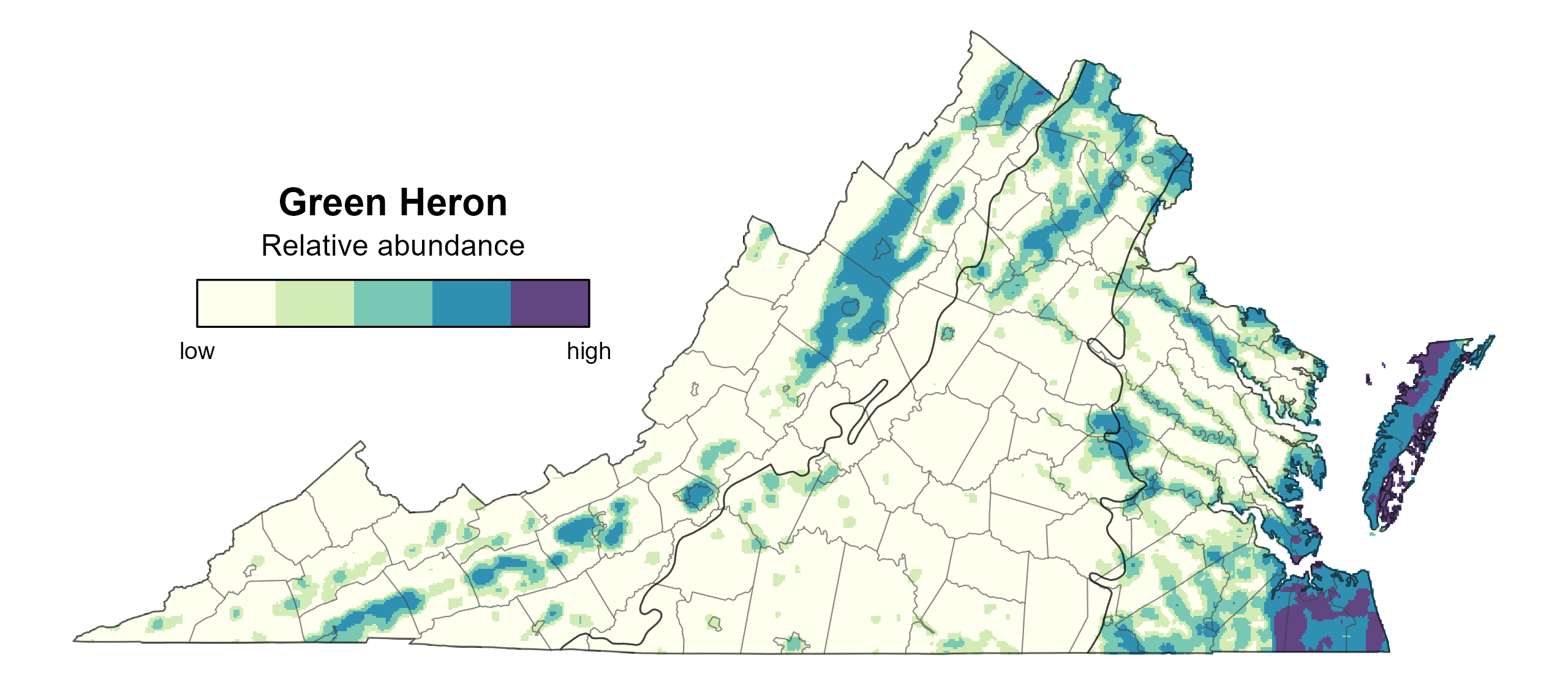 Green Herons have a wide distribution but occur at relatively low abundance levels. Their relative abundance was estimated to be high in the outer Coastal Plain but also locally high along inland rivers and in the Shenandoah Valley (Figure 5). They reached their highest predicted abundance in the Great Dismal Swamp and along waterways in the Hampton Roads region.