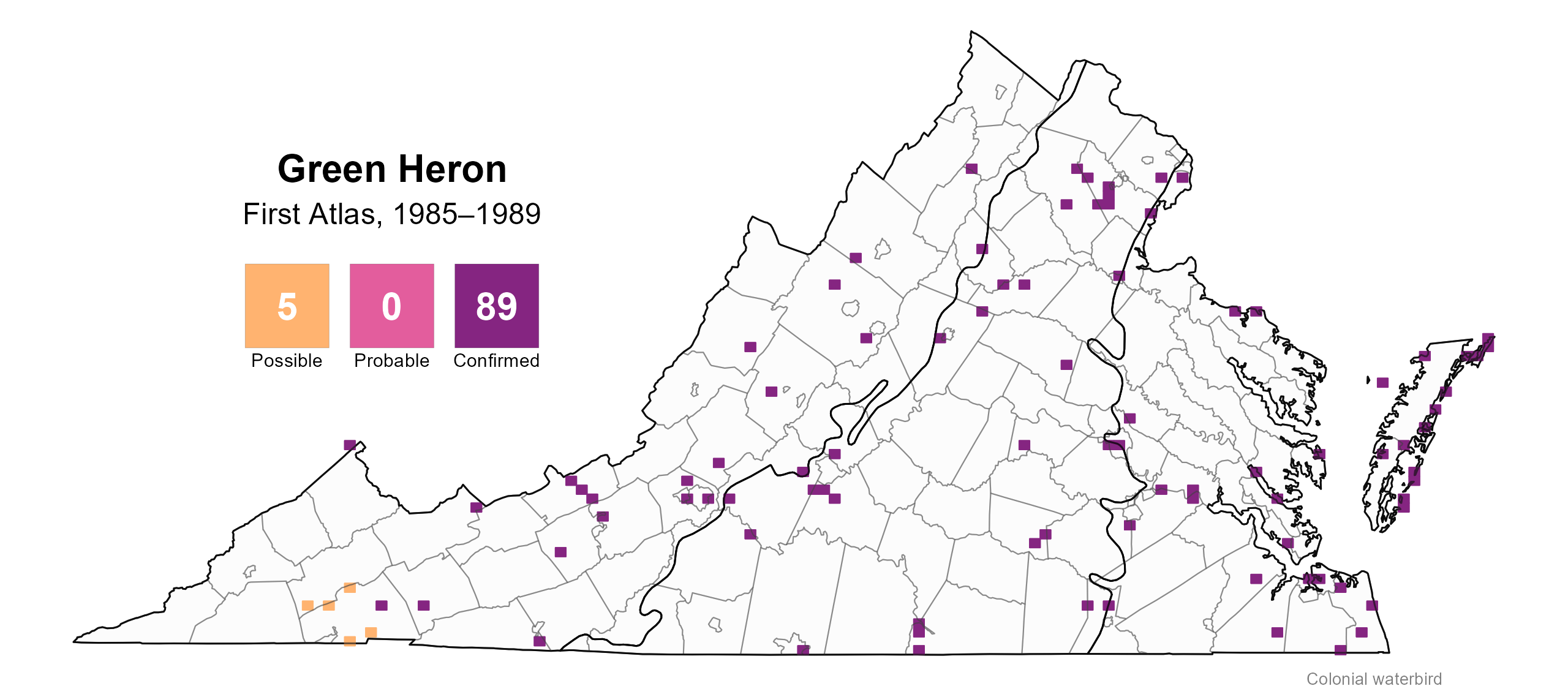 Figure 3: Green Heron breeding observations from the First Atlas (1985–1989). The colored boxes illustrate Atlas blocks (approximately 10 mi2 [26 km2] survey units) where the species was detected. The colors show the highest breeding category recorded in a block. The numbers within the colors in the legend correspond to the number of blocks with that breeding evidence category.