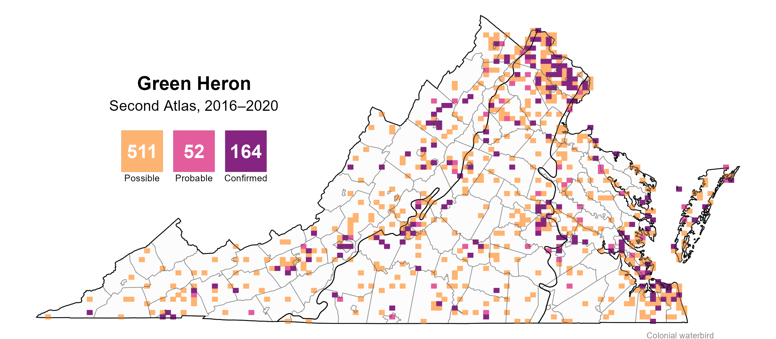 Figure 2: Green Heron breeding observations from the Second Atlas (2016–2020). The colored boxes illustrate Atlas blocks (approximately 10 mi2 [26 km2] survey units) where the species was detected. The colors show the highest breeding category recorded in a block. The numbers within the colors in the legend correspond to the number of blocks with that breeding evidence category.
