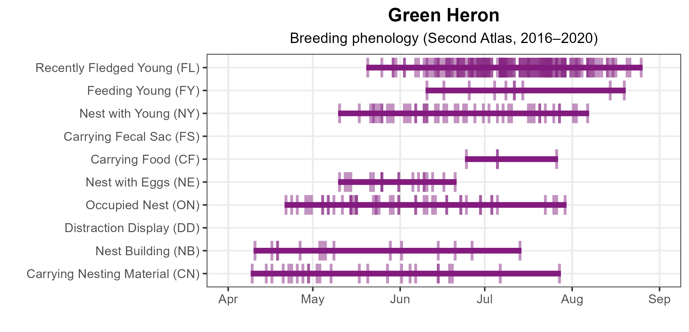 Figure 4: Green Heron phenology: confirmed breeding codes. This graph shows a timeline of confirmed breeding behaviors. Tick marks represent individual observations of the behavior.