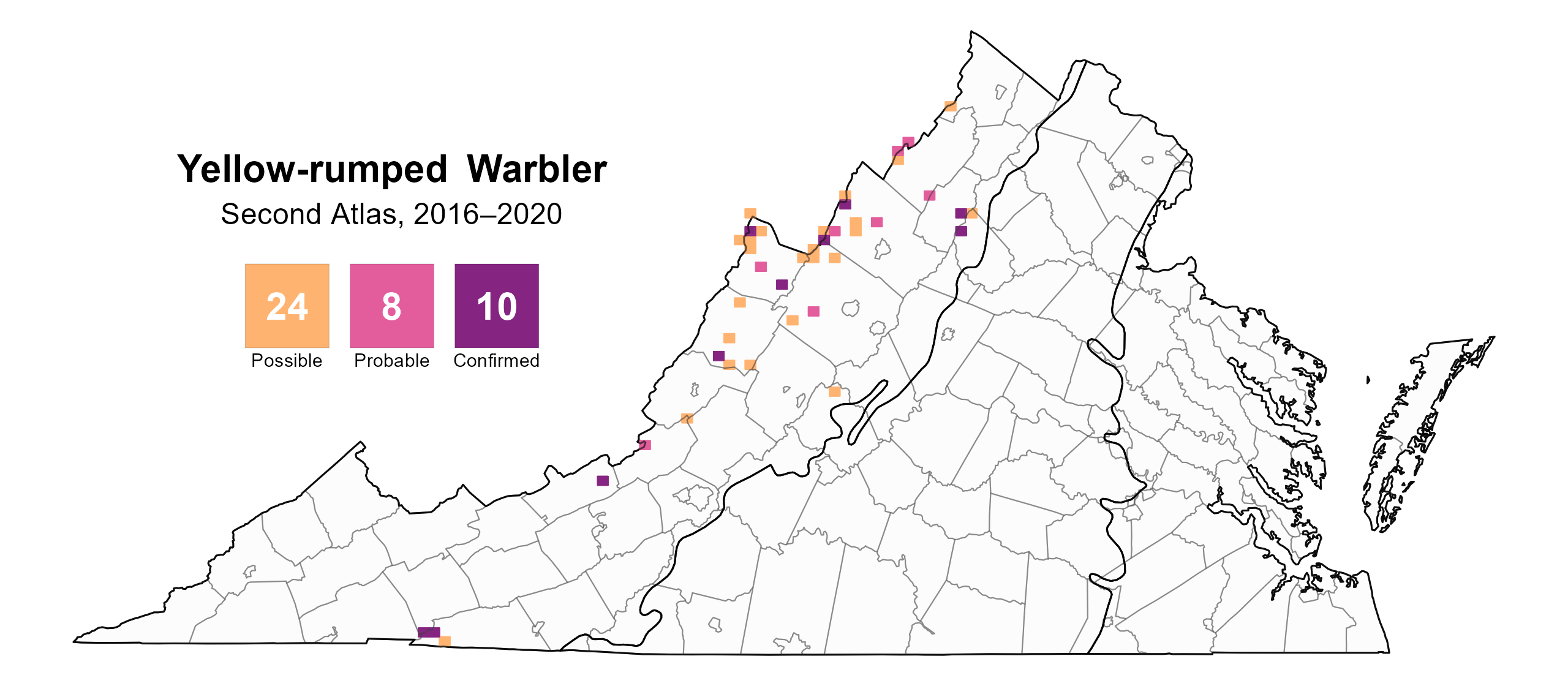 As a relatively new breeder, the Yellow-rumped Warbler has a limited distribution in the state. The Virginia breeding population may have originated from West Virginia, where the species is a local breeder, following a southward range expansion into New York and Pennsylvania since the 1970s (Hunt and Flaspohler 2020). Yellow-rumped Warblers are elevation-sensitive in Virginia, occurring only at 4,000 ft (1,220 m) or higher (Figure 1) (Lessig 2008). Elevation is the major predictor of its occurrence in the state.