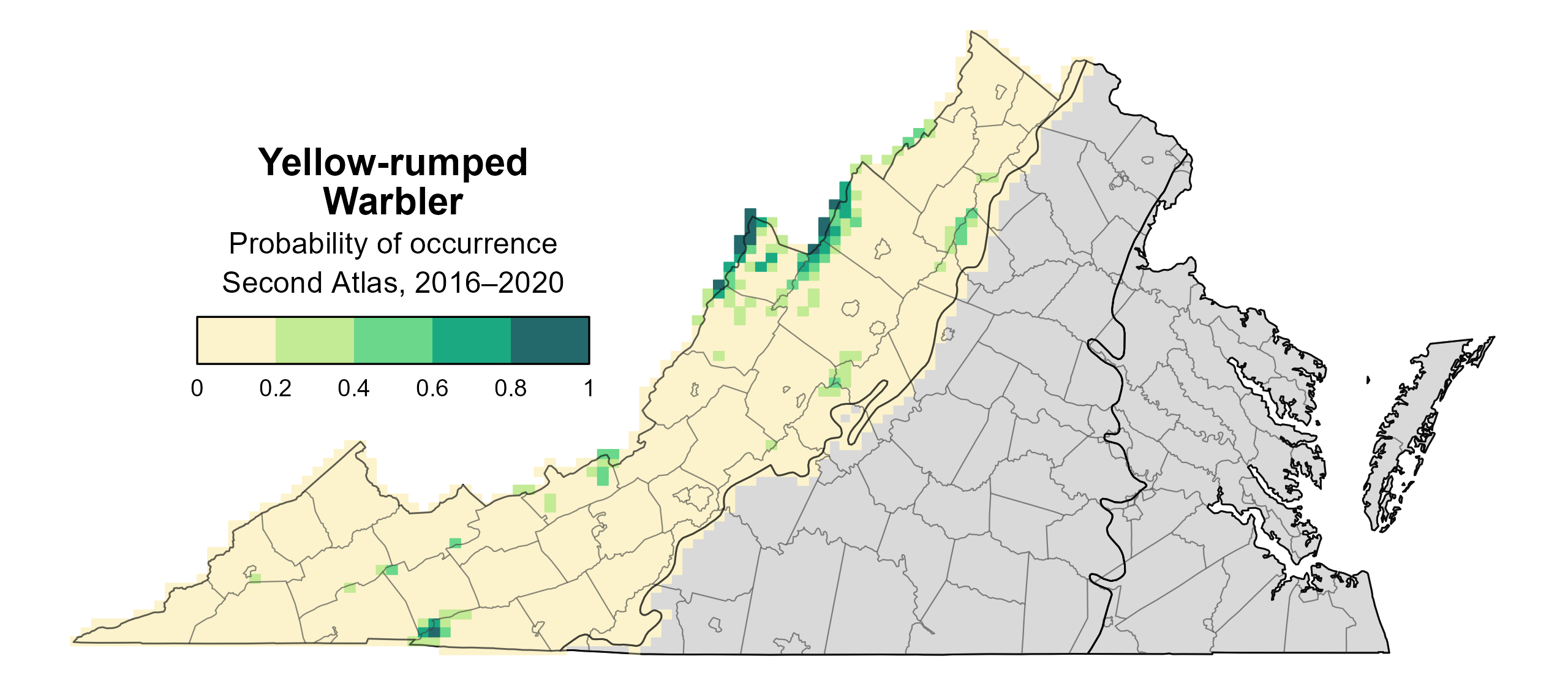 Figure 1: Yellow-rumped Warbler breeding distribution based on probability of occurrence (Second Atlas, 2016–2020). This map indicates the probability that this species will occur in an Atlas block (an approximately 10 mi2 [26 km2] survey unit) based on environmental (including habitat) factors and after adjusting for the probability of detection (variation in survey effort among blocks). Blocks in gray are outside the species’ core range and were not modeled.