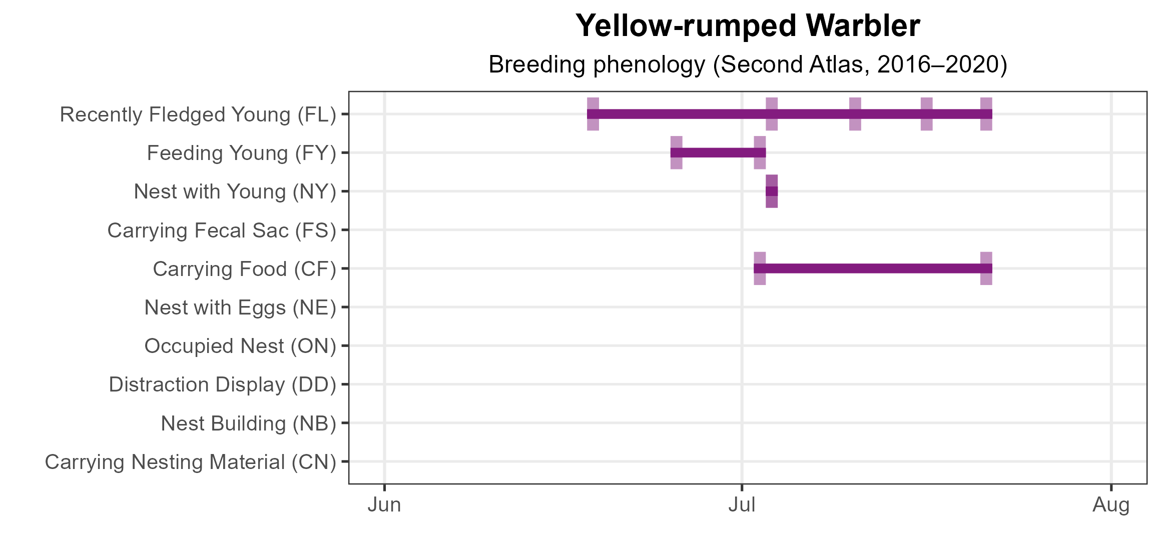 Figure 3: Yellow-rumped Warbler phenology: confirmed breeding codes. This graph shows a timeline of breeding behaviors. Tick marks represent individual observations of the behavior.