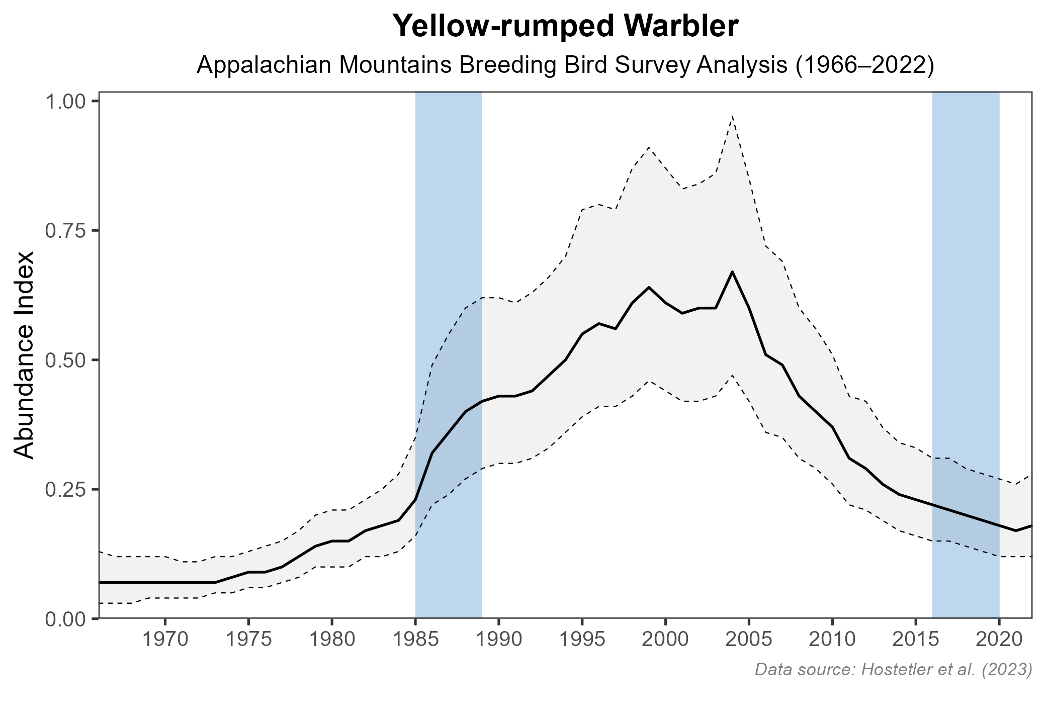 Figure 4: Yellow-rumped Warbler population trend for the Appalachian Mountain region as estimated by the North American Breeding Bird Survey. The vertical axis shows species abundance; the horizontal axis shows the year. The solid line indicates the estimated population trend; there is a 97.5% probability that the true population trend falls between the dashed lines. The shaded bars indicate the First and Second Atlas periods.
