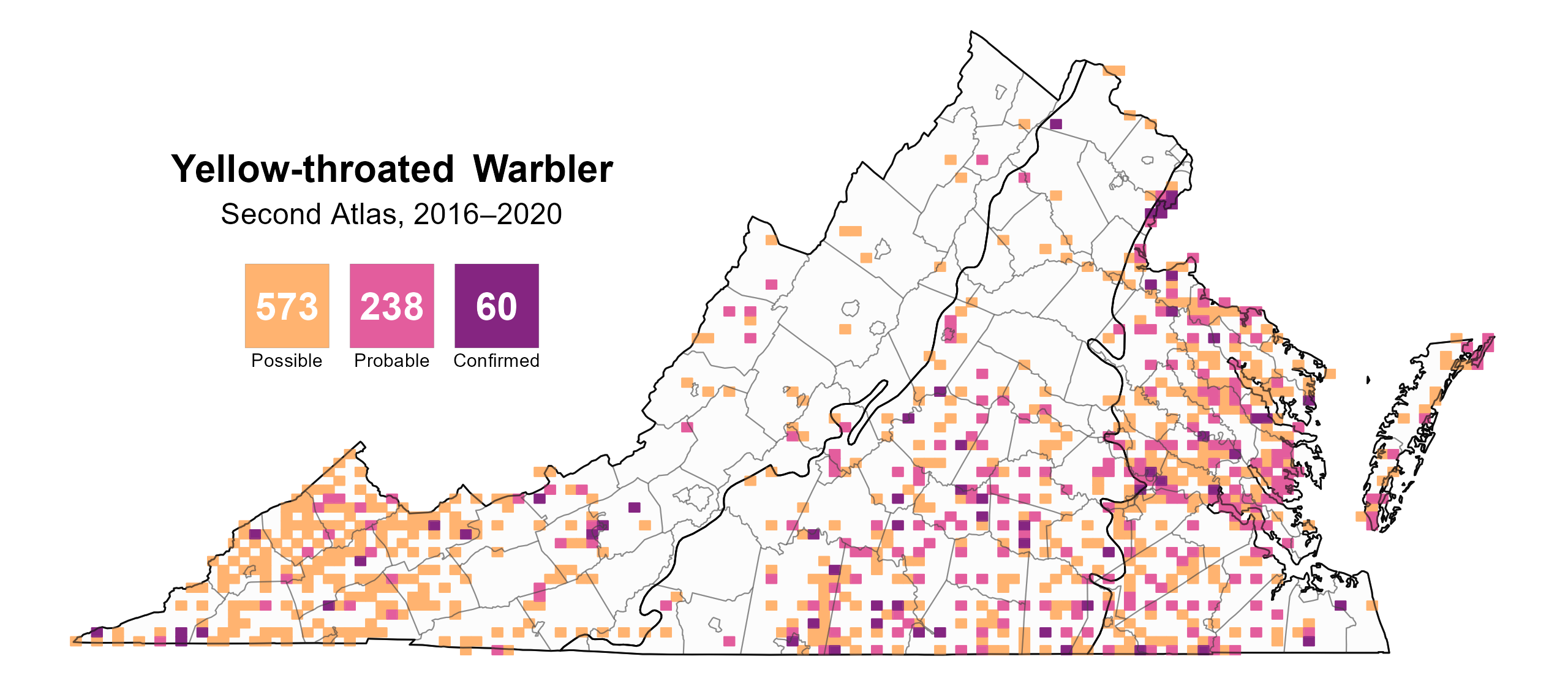 Figure 4: Yellow-throated Warbler breeding observations from the Second Atlas (2016–2020). The colored boxes illustrate Atlas blocks (approximately 10 mi2 [26 km2] survey units) where the species was detected. The colors show the highest breeding category recorded in a block. The numbers within the colors in the legend correspond to the number of blocks with that breeding evidence category.