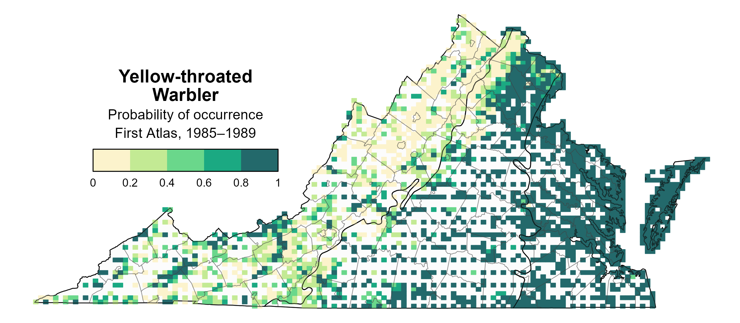 Figure 2: Yellow-throated Warbler breeding distribution based on probability of occurrence (First Atlas, 1985–1989). This map indicates the probability that this species will occur in an Atlas block (an approximately 10 mi2 [26 km2] survey unit) based on environmental (including habitat) factors and after adjusting for the probability of detection (variation in survey effort among blocks). Blocks in white were not surveyed during the First Atlas and were not modeled.