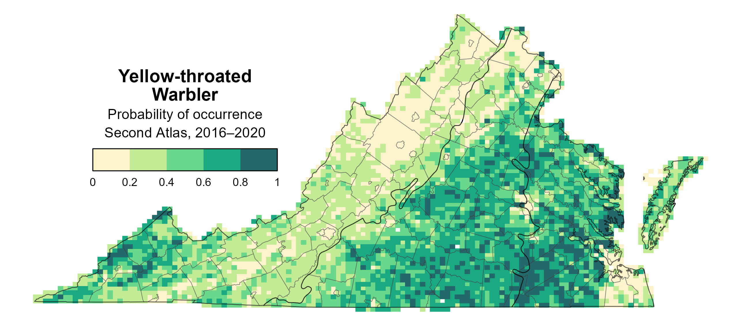 Yellow-throated Warblers are found throughout the state but are most likely to occur in the central and southern Piedmont region and the Coastal Plain region (Figure 1). They are less likely to occur in the Mountains and Valley region, except in the southwestern corner where lower elevation pine forests are available. The likelihood this species occurs in a block increases as the number of forest patches and habitat types increase, and its probable occurrence decreases in blocks with more agricultural and developed lands, such as around Richmond and Virginia Beach.