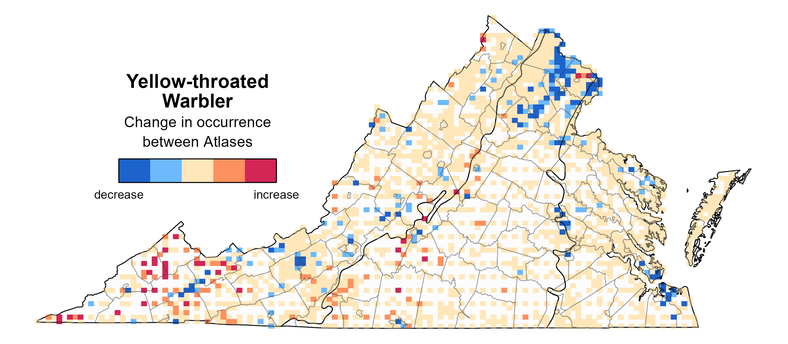 Between the First and Second Atlases (Figures 1 and 2), the change in the Yellow-throated Warbler’s likelihood of occurrence was minimal across much of the state (Figure 3). A few notable exceptions include decreases in probable occurrence in urban areas, including Hampton Roads, Northern Virginia, and Richmond, and an increase in the Cumberland Mountains in the Mountains and Valleys region.