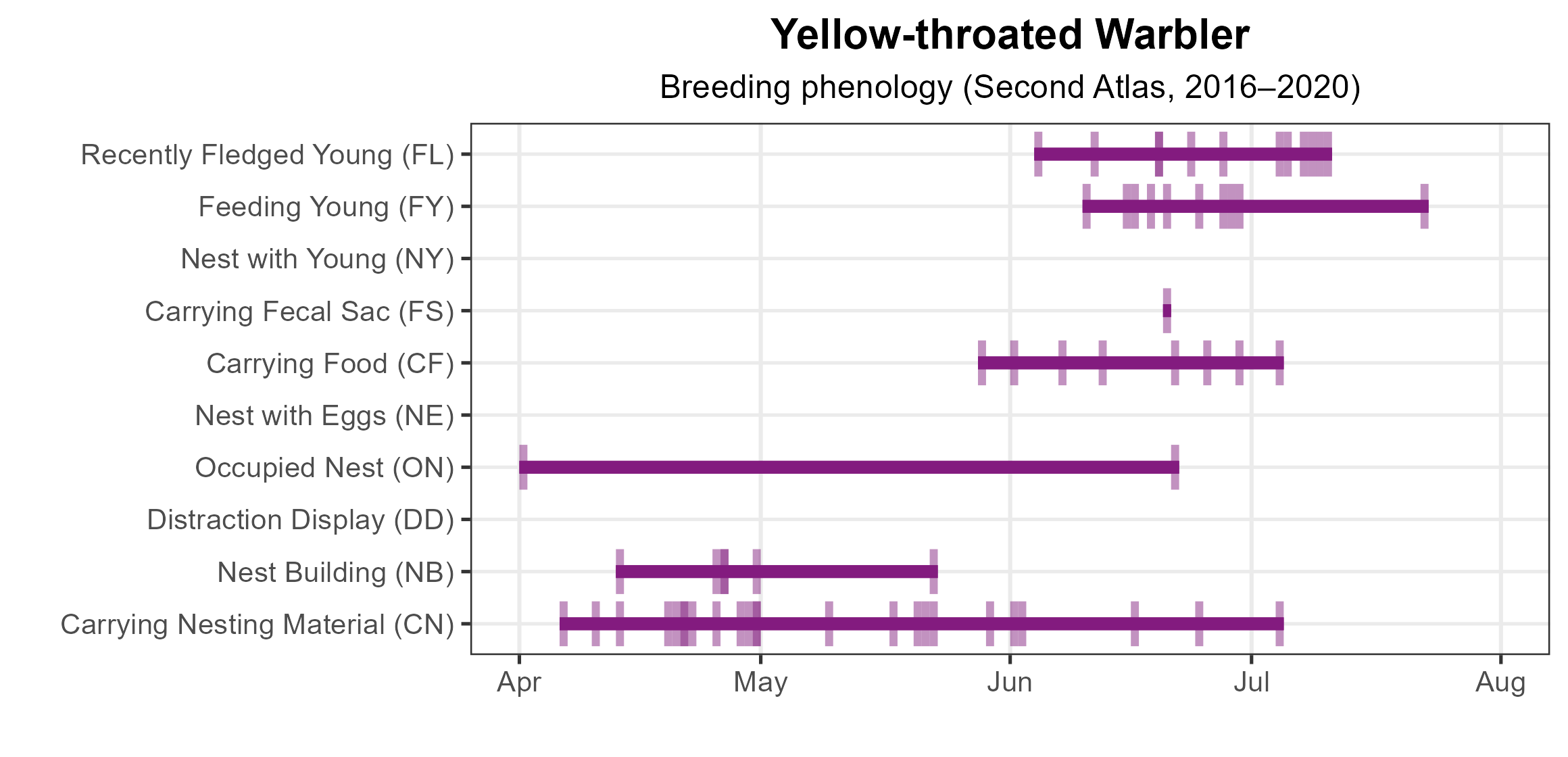 Figure 6: Yellow-throated Warbler phenology: confirmed breeding codes. This graph shows a timeline of confirmed breeding behaviors. Tick marks represent individual observations of the behavior.